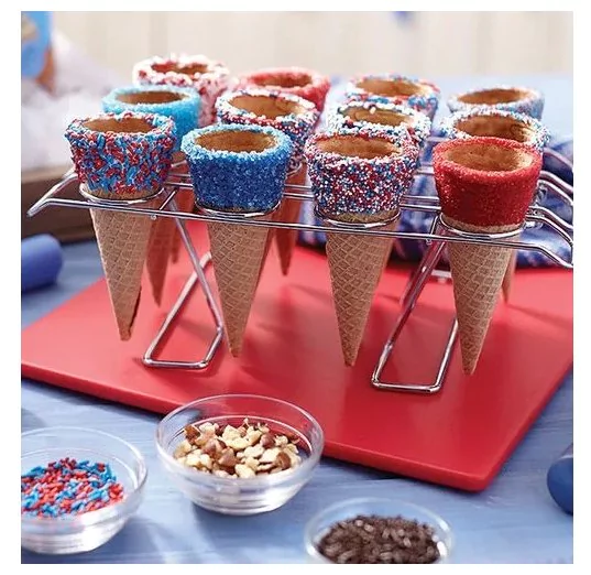Rellene los cucuruchos con magdalenas o su masa predilecta son el sueño de un niño hecho realidad con este soporte para horno. Solo cárguelo los cucuruchos con azúcar, rellénelo con su masa de cupcake favorita y hornéelo. Después de que se enfríen, decórelos con glaseado y espolvorea sume una cereza encima y sírvalos desde el soporte. Para fiestas de cumpleaños, reuniones familiares, etc.
